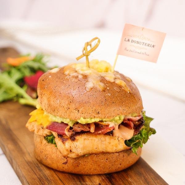 Homemade Keto, Chicken Roasted, Beef Bacon, smashed Avocado and sour cabbage cheese, Rocca, and mix cheese