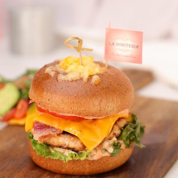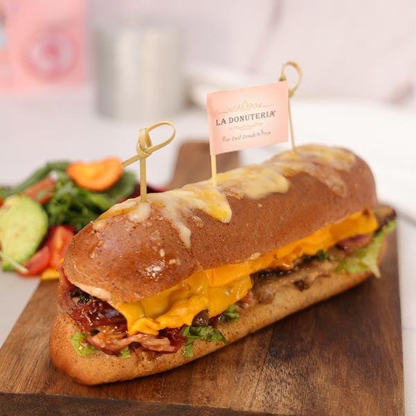 Home Made Keto Baguette, Beef Brisket and Beef bacon, Parmesan Cheese Sauce, Grilled Mushroom, Rocca, Cheddar