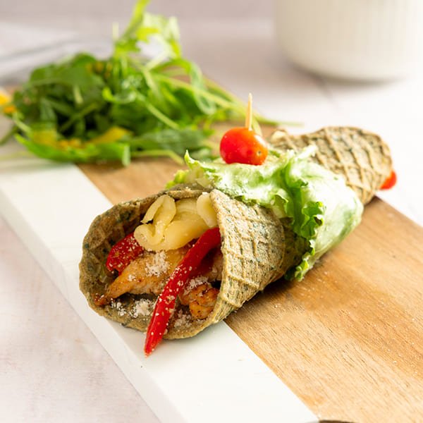 Grilled chicken with sauteed peppers and onions in a keto friendly wrap