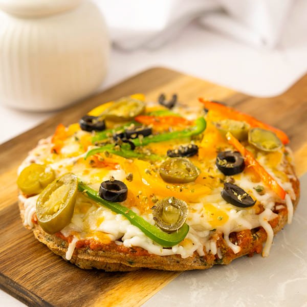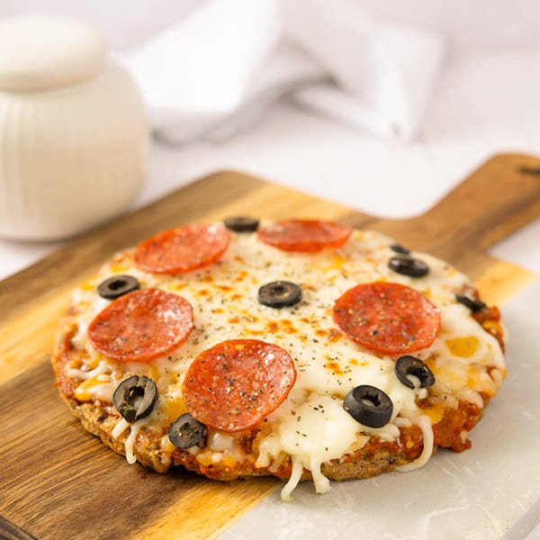 Pepperoni pizza Keto bread, Mixed cheese, olive and tomato.