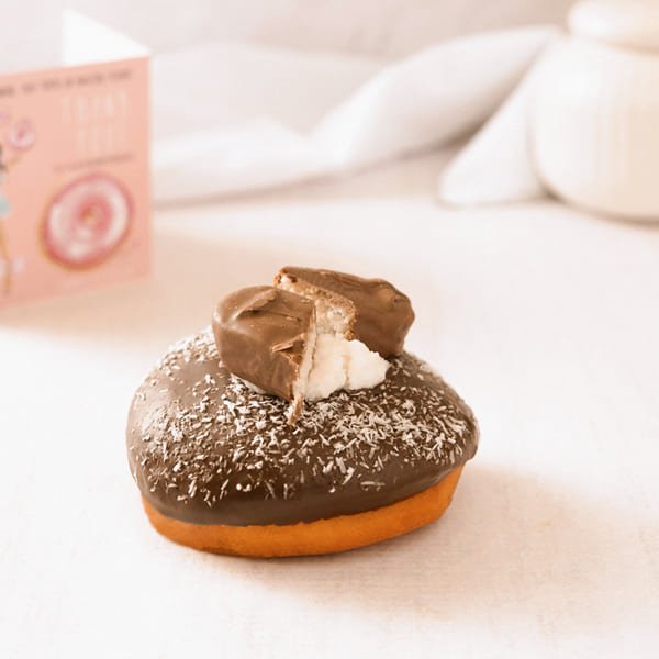 Filled with coconut filling, glazed with dark chocolate, topped with grated coconut and Bounty sticks