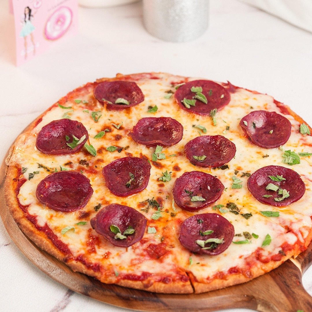 Keto Pizza dough made from Almond flower, Topped with with our home-made Tomato Sauceو the finest Pepperoni slices, Mozzarella, Parmesan cheese, Oregano and Extra virgin olive Oil. Medium Size