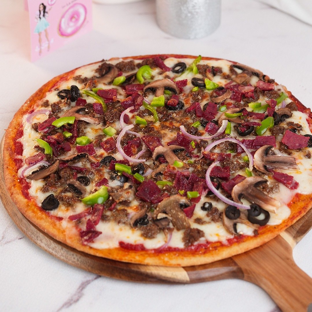 Keto Pizza dough made from Almond flower, Topped with our home-made special Italian sauce, the finest ground Beef, Pepperoni slices, Mozzarella, Parmesan cheese, Green Pepper, Onion, Mushroom, Oregano and Extra virgin olive Oil. Medium Size
