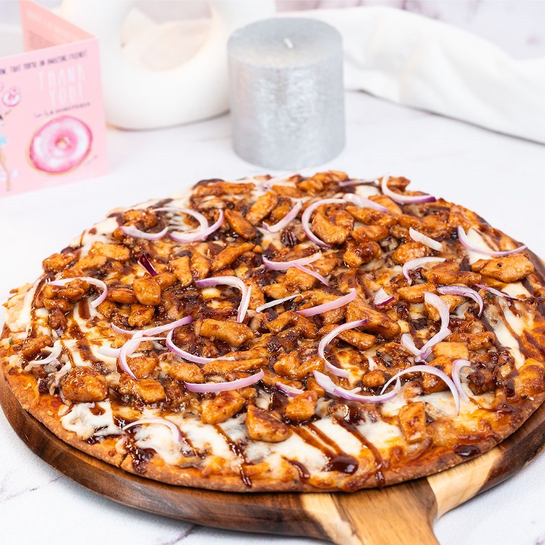 Keto Pizza dough made from Almond flower, Topped with our home-made Tomato Sauce, cooked chicken breast, Mozzarella, Gouda, Parmesan cheese, Onion, Finest SUGAR FREE BBQ Sauce, Oregano and Extra virgin olive Oil. Medium Size