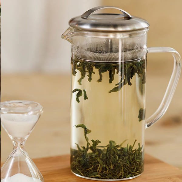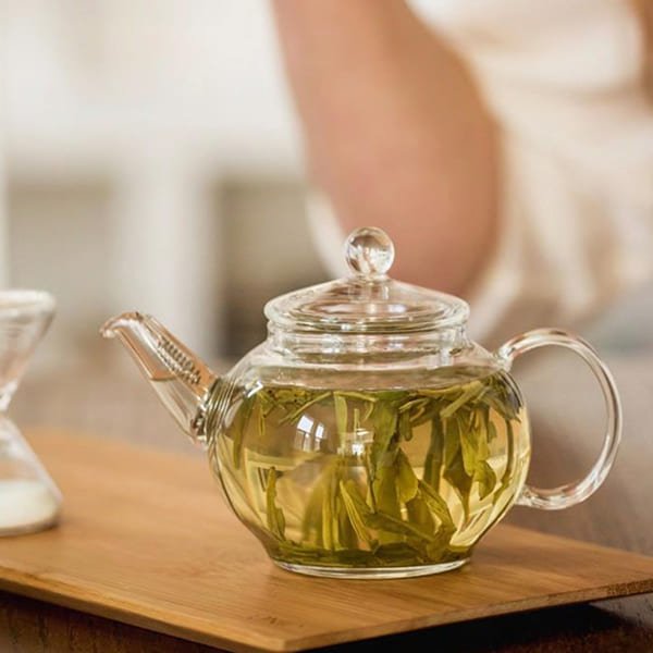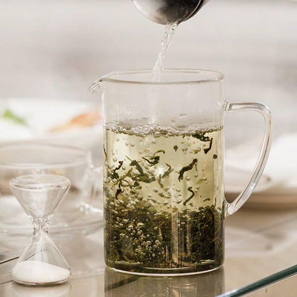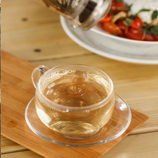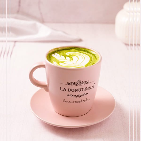A hot drink made by blending organic matcha with hot water, providing a rich and earthy tea experience