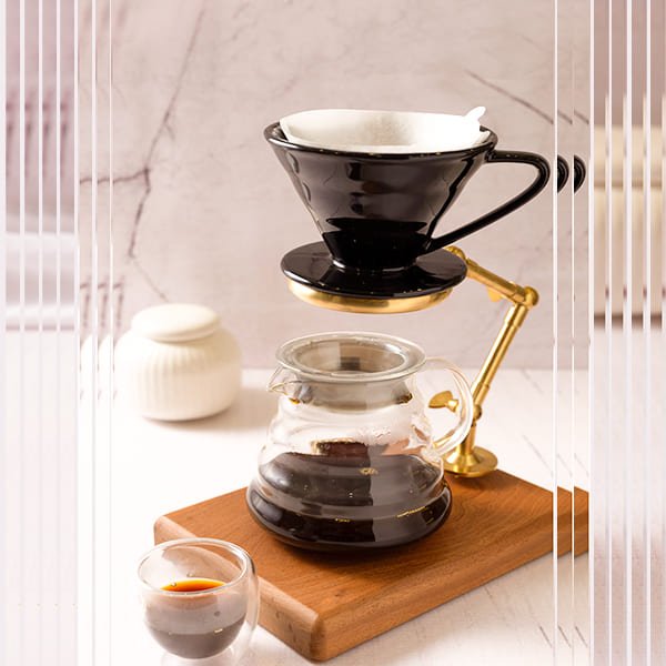 A coffee brewed using the V60 pour-over method, where hot water is poured over finely-ground coffee beans